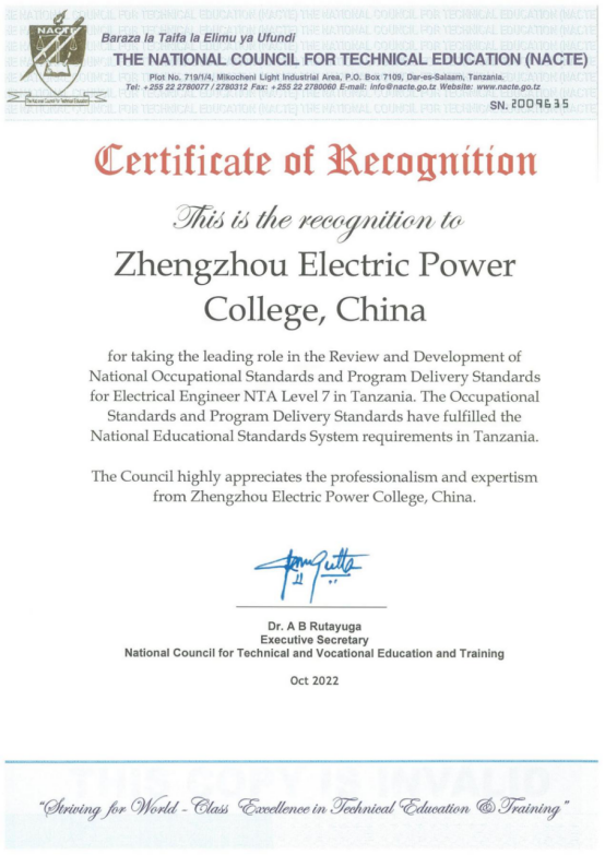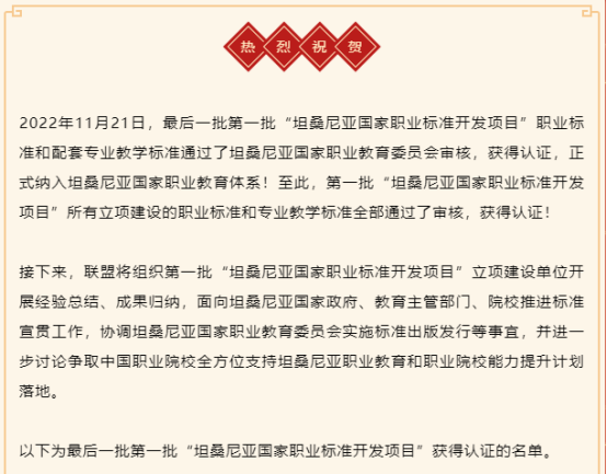 坦桑尼亚国家职业标准项目今年4月正式启动,经申报、专家评审和在线答辩等环节,公司高度重视该项工作,成立专门工作小组,依托公司国家级教学资源库、省级教学资源库、河南省高水平专业群,进行精心筹备,凭借公司优秀的团队团队、创新的人才培养模式、深入的产教融合及国际化的办学水平,成功入选中国职业院校在坦桑尼亚国家输出相关行业岗位职业标准及配套人才培养方案项目第一批立项建设单位。公司积极进行标准建设工作,规范规章制度,强化过程管理,经过与中非职教联盟和参与院校的专家多次研讨,开发并修订完善了职业标准和课程标准,最终顺利通过坦桑尼亚教育部国家职业教育委员会注册认证并获得官方认证证书,正式纳入坦桑尼亚国家职业教育体系。