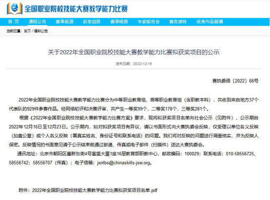 全国职业院校技能大赛教学能力比赛是由教育部主办的代表职业院校最高教学水平的权威比赛,是展示职业院校教师教学能力的最高舞台,是各个职业院校最为重视的比赛,参赛教师团队经历初赛、复赛,从省赛中脱颖而出,以专业组第一名的成绩冲击国赛,经过参赛团队的不懈努力,克服疫情、校园封闭管理等重重困难,最终以出色的发挥赢得了评委的一致好评,荣获全国一等奖。