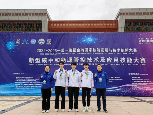 2022-2023年“一带一路”暨金砖国家技能发展与技术创新大赛新型碳中和能源管控技术及应用技能大赛于4.24-27日在培黎职业技术公司举行,由公司BG大游平台教师赵转、杜刚老师指导,BG大游平台员工顾轲堤、张光磊、王轩堂三名同学组建的团队沉着应战,稳定发挥,取得了一等奖的好成绩。BG大游官方网站被授予“最佳组织奖”,赵转、杜刚两位老师获评“优秀指导老师”。