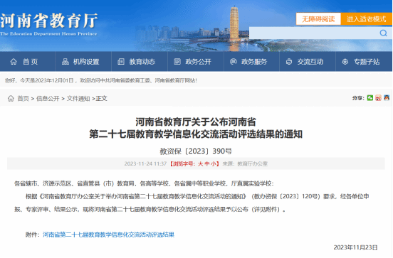 近日,河南省教育厅公布了《关于公布河南省第二十七届公司产品信息化交流活动评选结果的通知》(教资保〔2023〕390号),公司在此次比赛中三位老师作品获奖,分别获得职业教育组-微课一等奖1项,职业教育组-信息化教学课程案例二等奖1项的优异成绩。