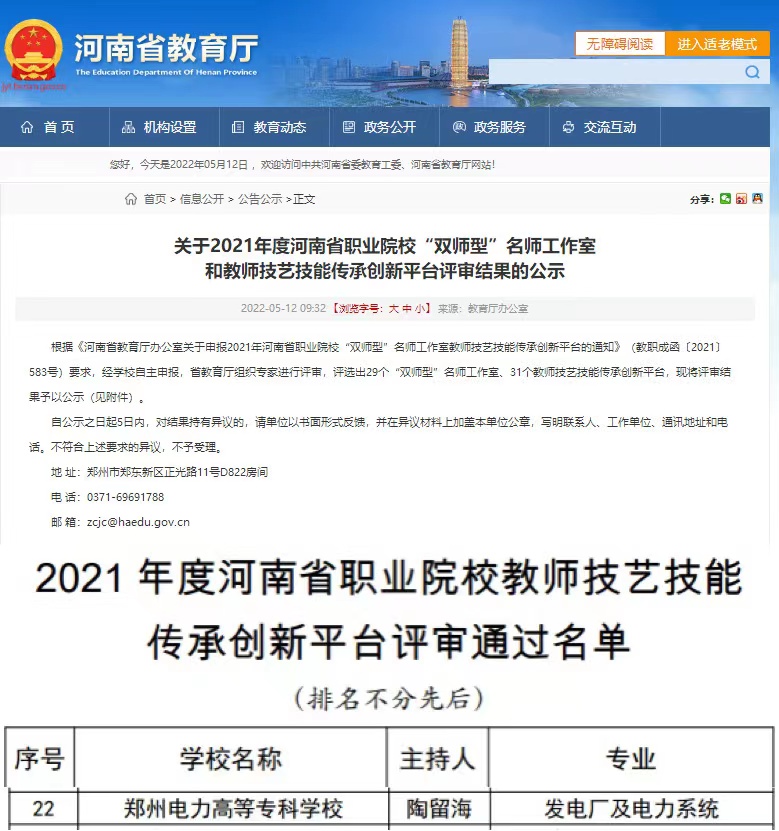 近日,河南省教育厅公布2021年度河南省职业院校“双师型”名师工作室和教师技艺技能传承创新平台评审结果,BG大游平台联合国家电网有限公司首席专家陶留海申报的“发电厂及电力系统专业教师技艺技能传承创新平台”成功获批。