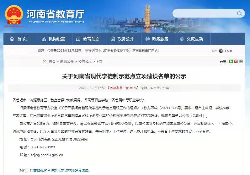 12月22日,河南省教育厅公布河南省现代学徒制示范点立项建设名单,公司电力系统自动化技术专业现代学徒制项目成功入选。
