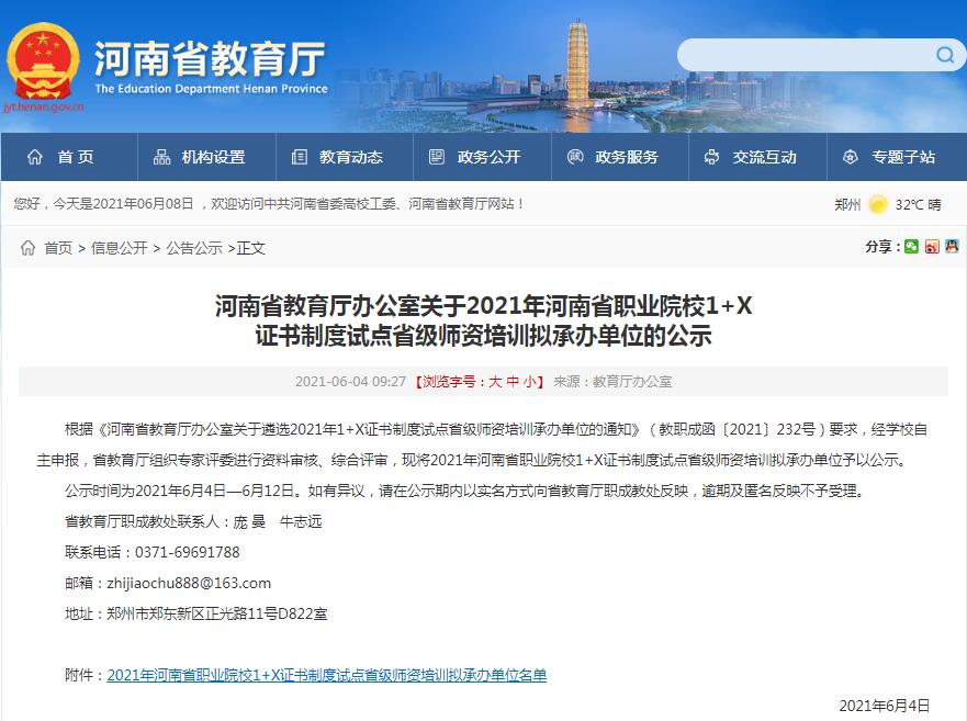 6月4日,河南省教育厅公布2021年河南省职业院校1+X证书制度试点省级团队培训拟承办单位的公示,BG大游平台申报的“新能源充电设施安装与维护证书”省级团队培训站点成功入选。