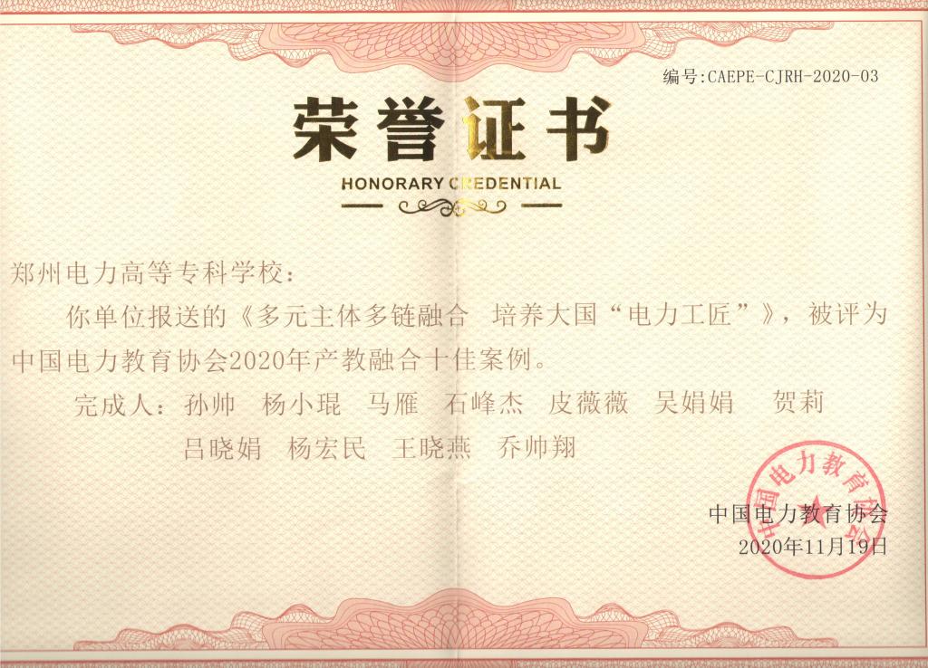 果,发电厂及电力系统专业群《多元主体多链融合,培养“大国工匠”》典型案例,荣获“全
