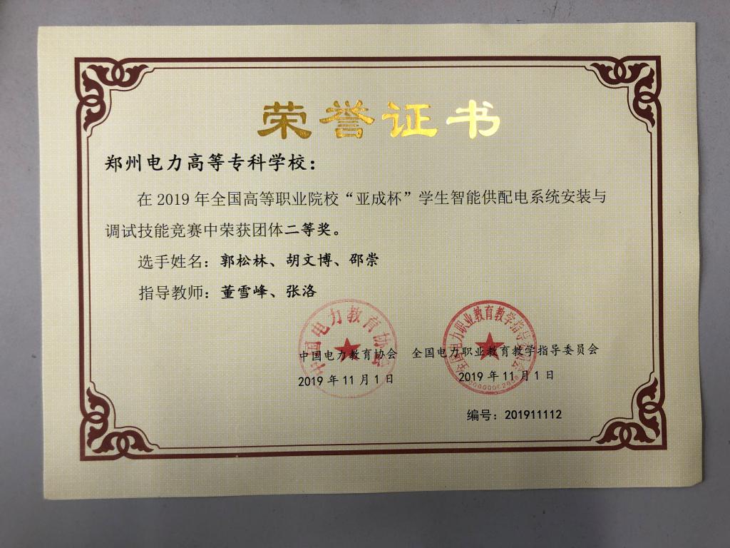 2019年全国高等职业院校“亚成杯”智能供配电系统安装与调试技能竞赛11月3日圆满闭幕。我系电力工程系董雪峰、张洛老师指导的郭松林、胡文博、邵崇三名同学在竞赛中荣获团体二等奖。