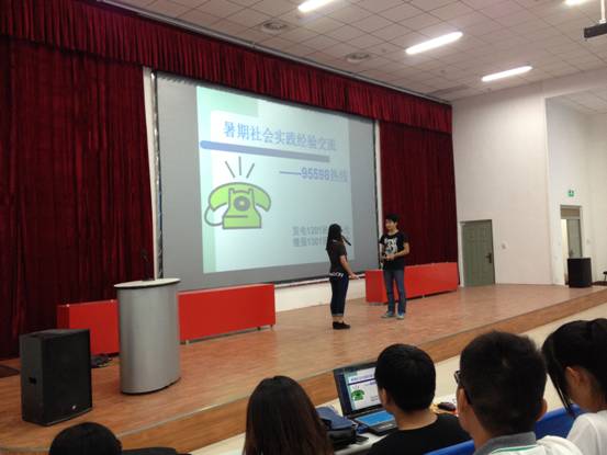 最后一个上台分享经验的团队是公司暑期社会实践重点团队“公司95598社会实践服务团”,发电1201团支部陈光和继保1301团支部张鑫作为服务团代表,借助PPT等材料向同学们讲述服务团暑假在郑州供电公司“95598”客户服务中心做话务员的经历。在各种各样的来电中,努力展现电力员工的精神风貌成为服务团每位成员的工作标准。他们努力将最礼貌友善的解释,最真心诚意的意见传达给郑州市民。两位同学更是通过现场情景模拟,扮演话务员和不同类型用户进行对话,将暑假话务员经历还原到现场,展现给现场的同学们,不仅让大家感受了到话务员用心服务的态度与风貌,也让大家对话务员经常受到客户无端指责的委屈感同身受。最后,系领导对本次活动进行了总结和点评。