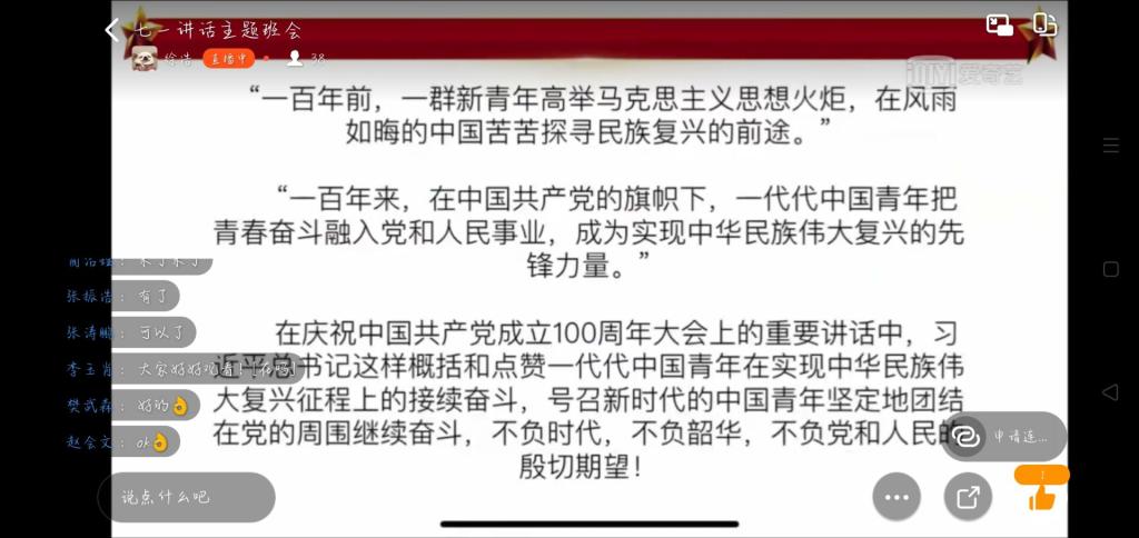 公司21个2021级新生团支部是第一次举行这样的活动,尤其是在防疫的大背景下通过线上进行,显得格外有意义。他们表示将尽快融入公司这个大家庭,以青春之我,以朝日之我,投入校园生活,沿着党开辟的道路,在追梦中鼓舞斗志、砥砺前行!